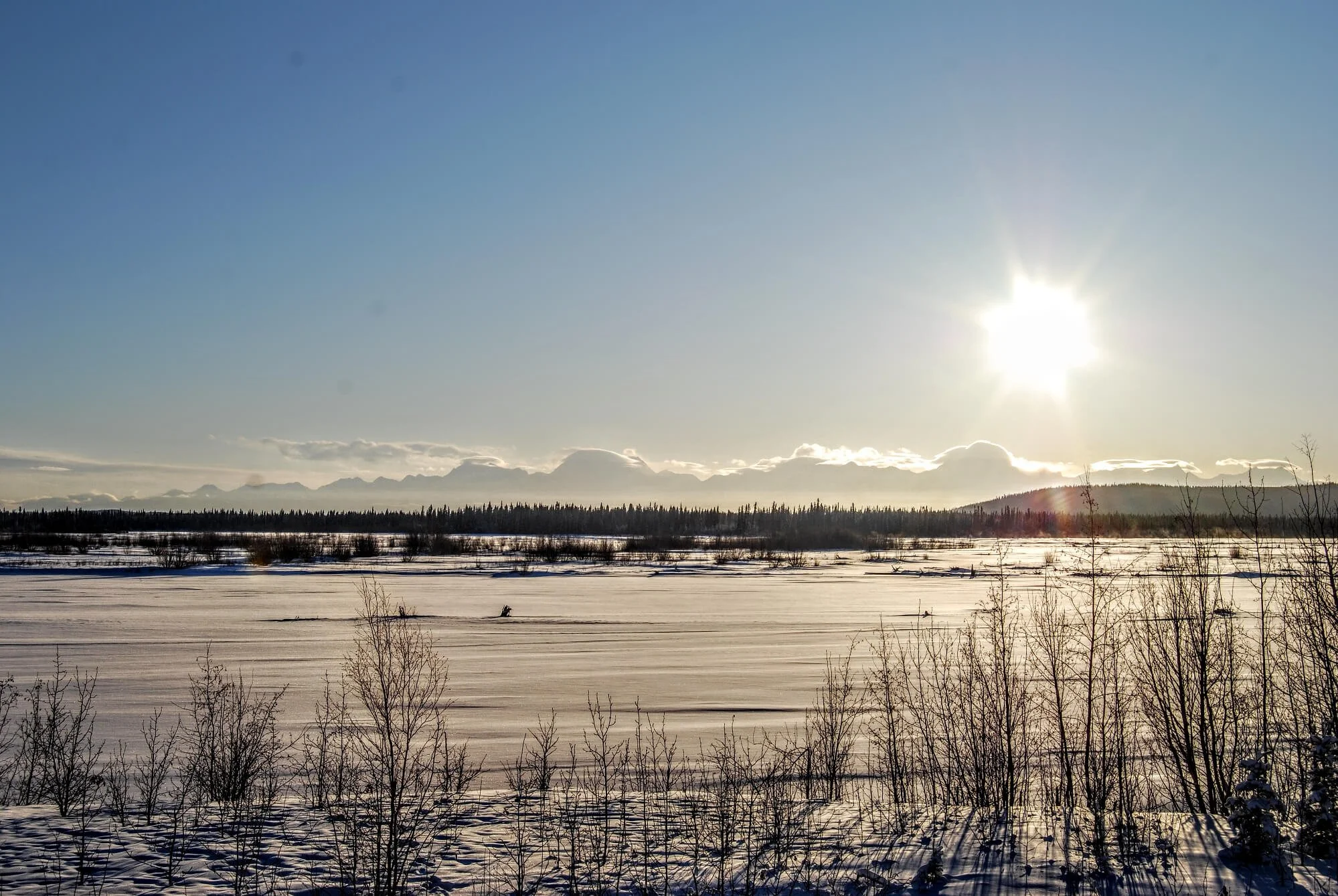 We followed the Tanana River down Richardson Highway to Delta Junction where we turned around due to time constraints and road conditions. It is 64 miles between Salcha and Delta Junction and the drive would take you 60 minutes in any other season but winter. It took us 90 minutes in the icy conditions.
